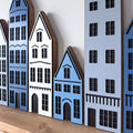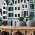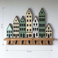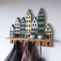 Ta funkcjonalna i stylowa półka ścienna ma rząd minimalistycznych metalowych haczyków pod półką i dekoracyjne wycięcia HDF w kształcie domów nad nią. Dostępna w ciepłych, zielonych lub niebieskich motywach kolorystycznych, które dopasują się do Twojej przestrzeni.